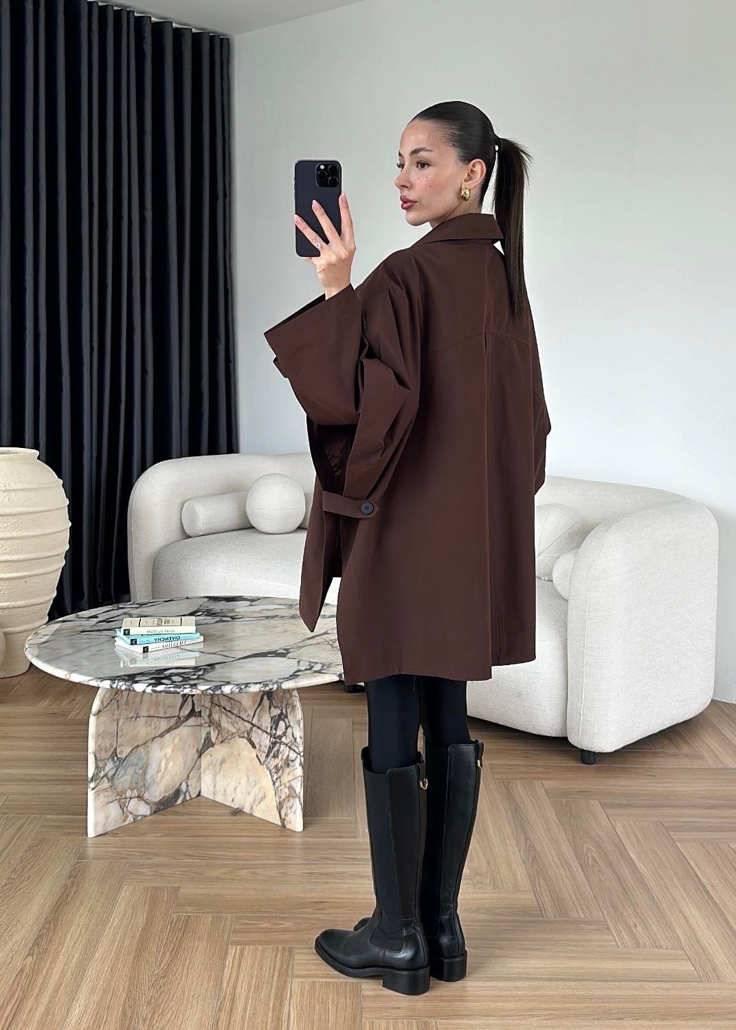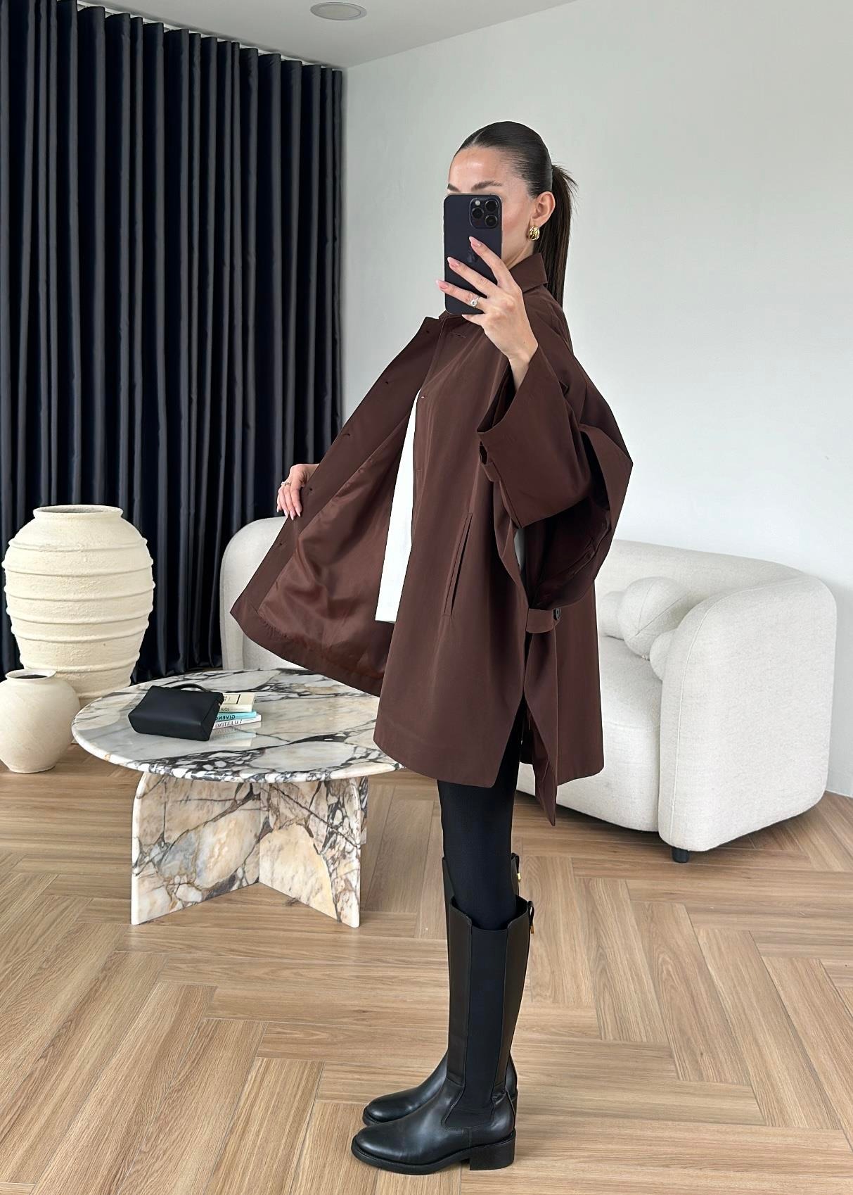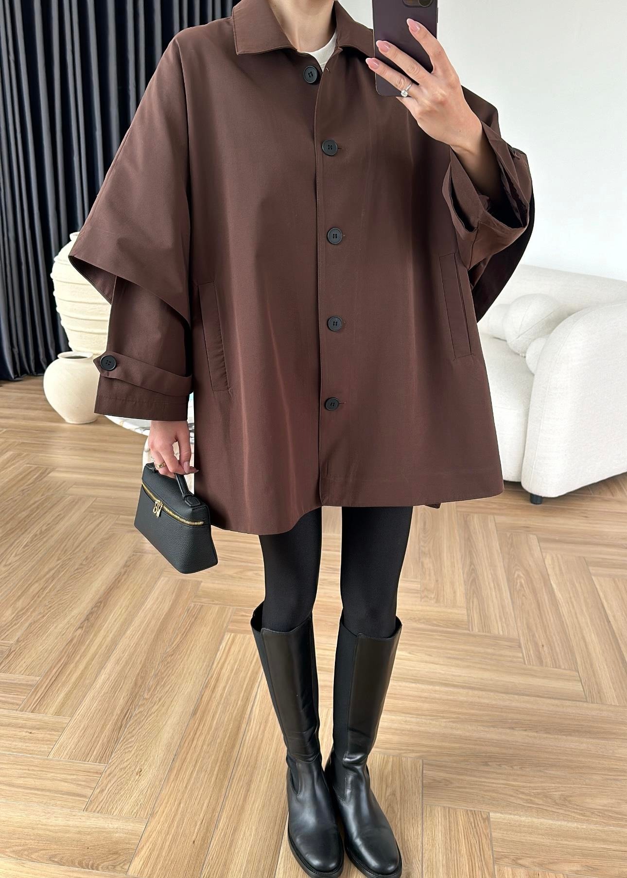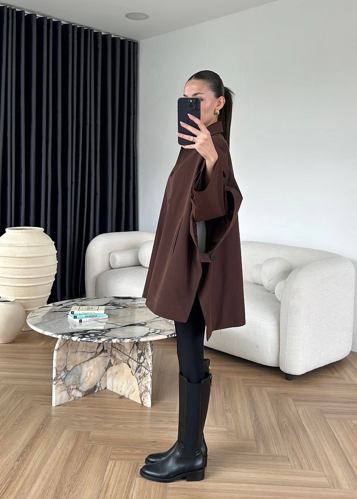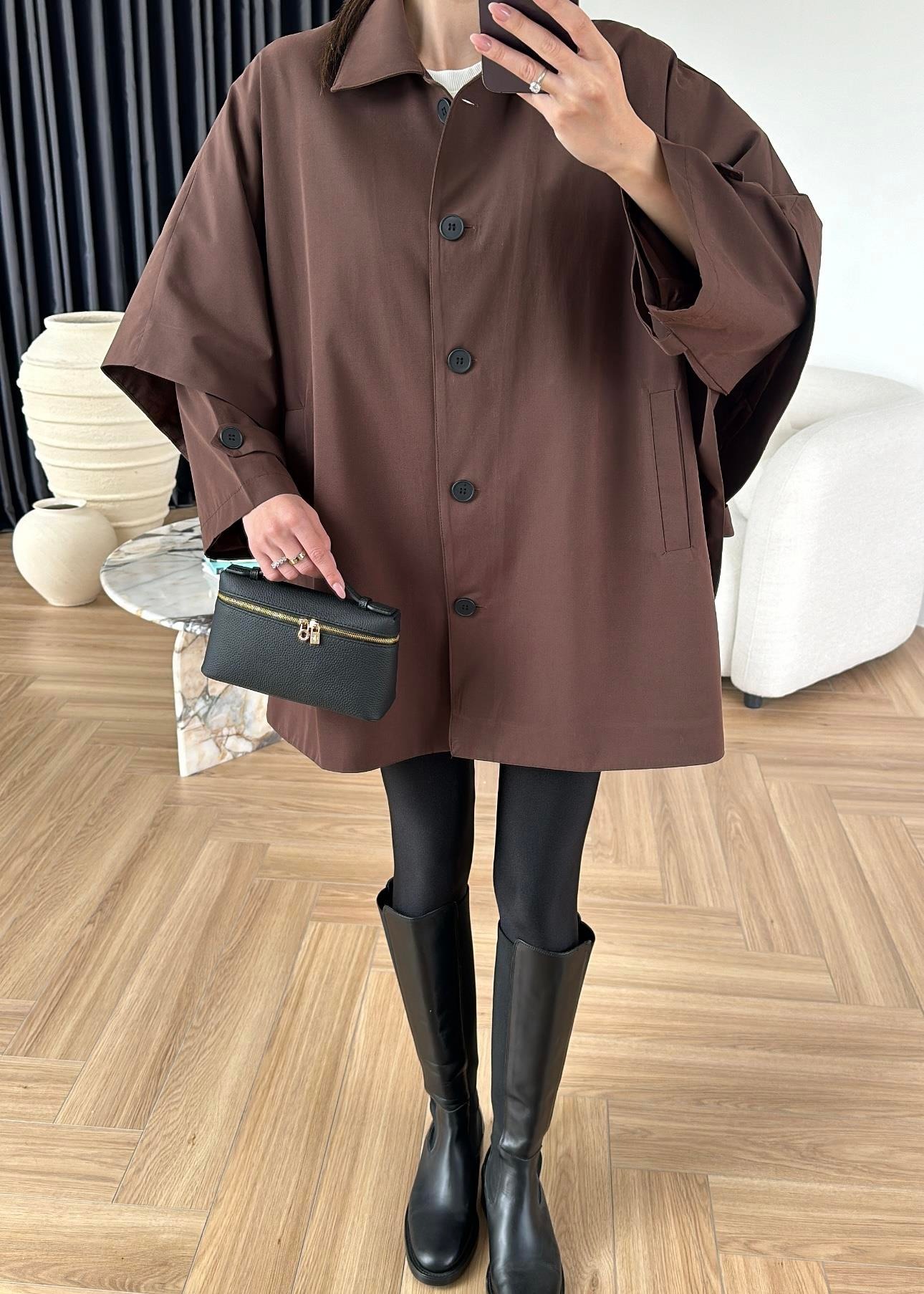 Uzun Kollu Pelerin Trençkot KAHVERENGİ