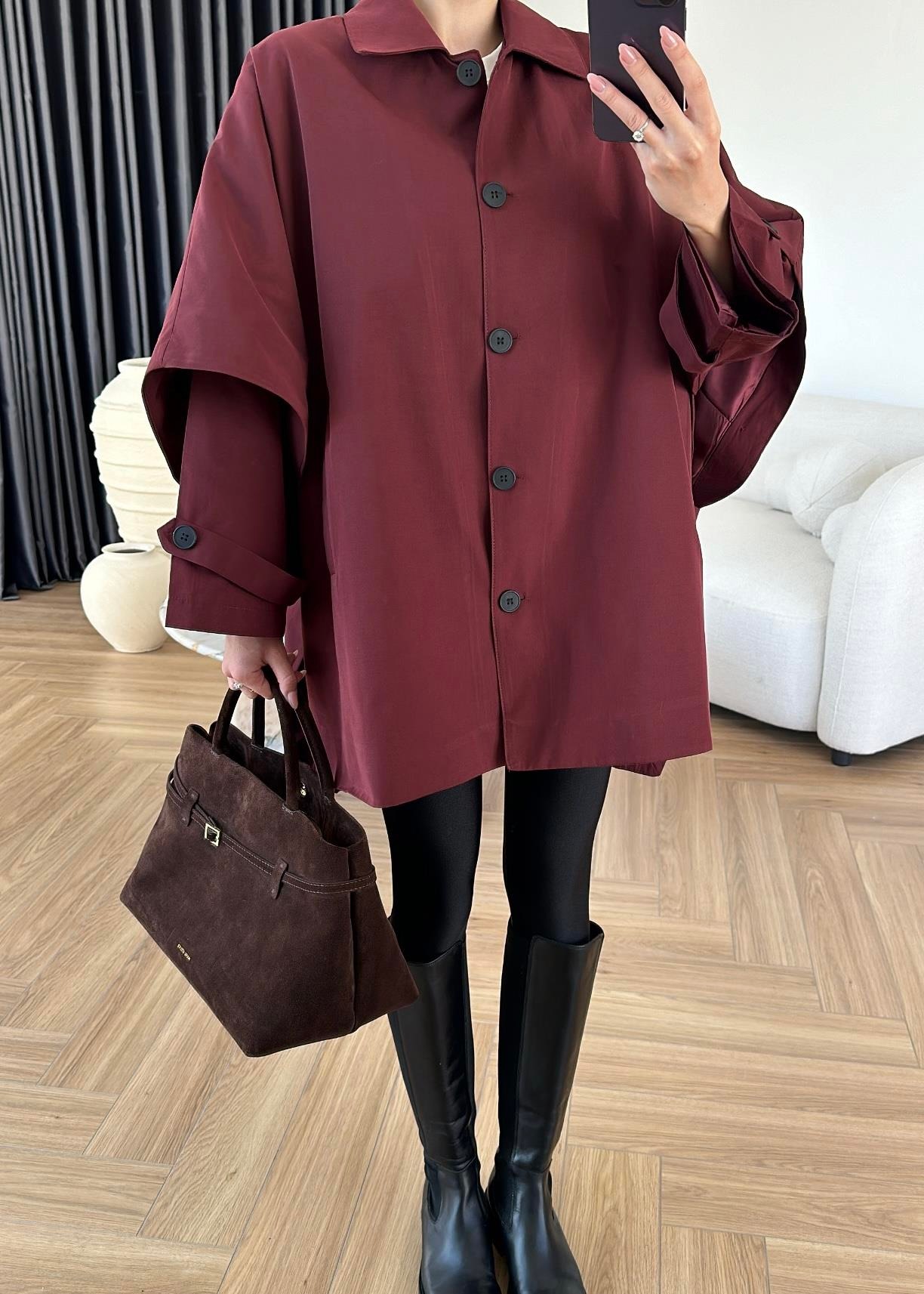 Uzun Kollu Pelerin Trençkot BORDO