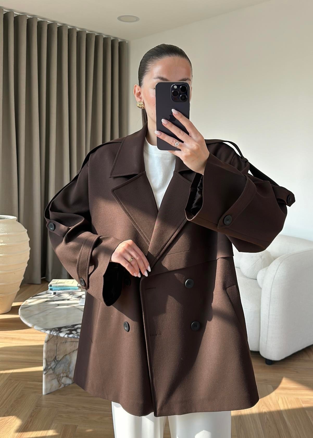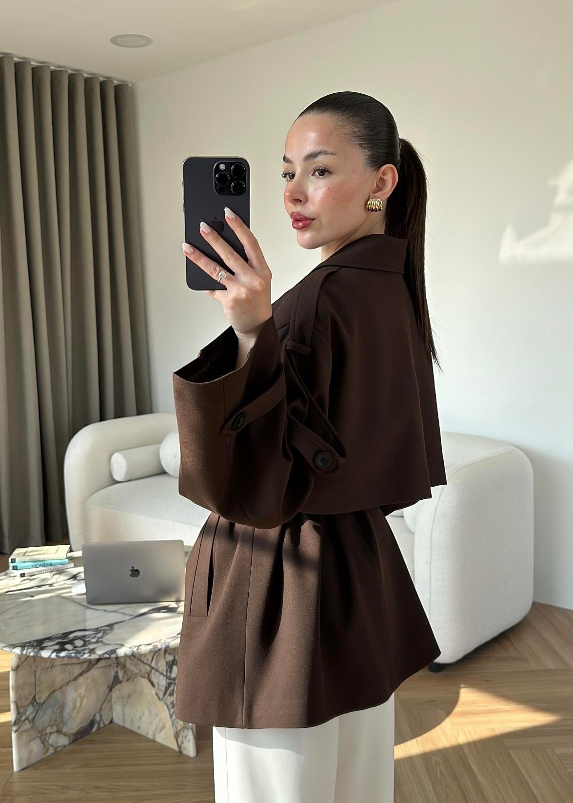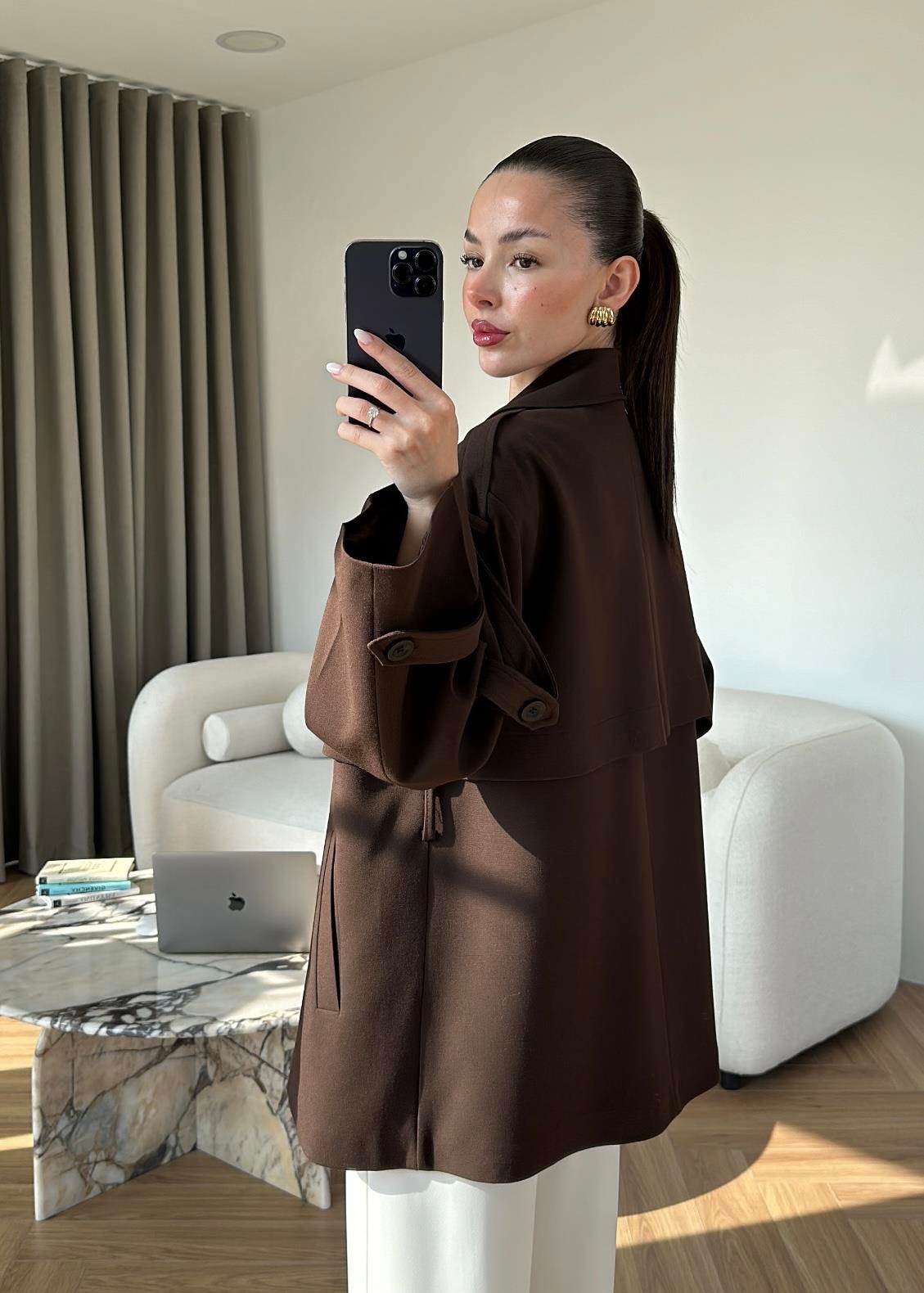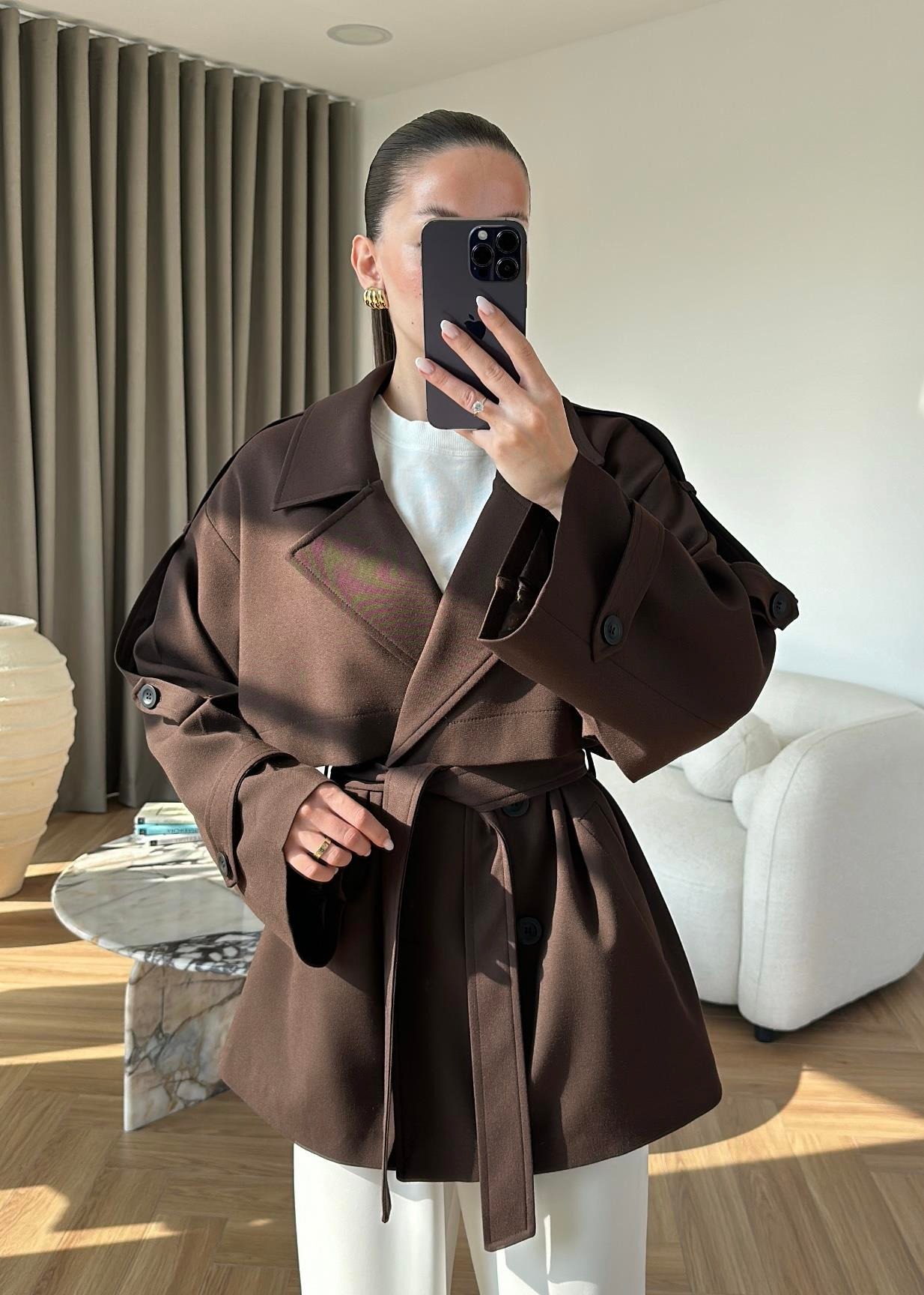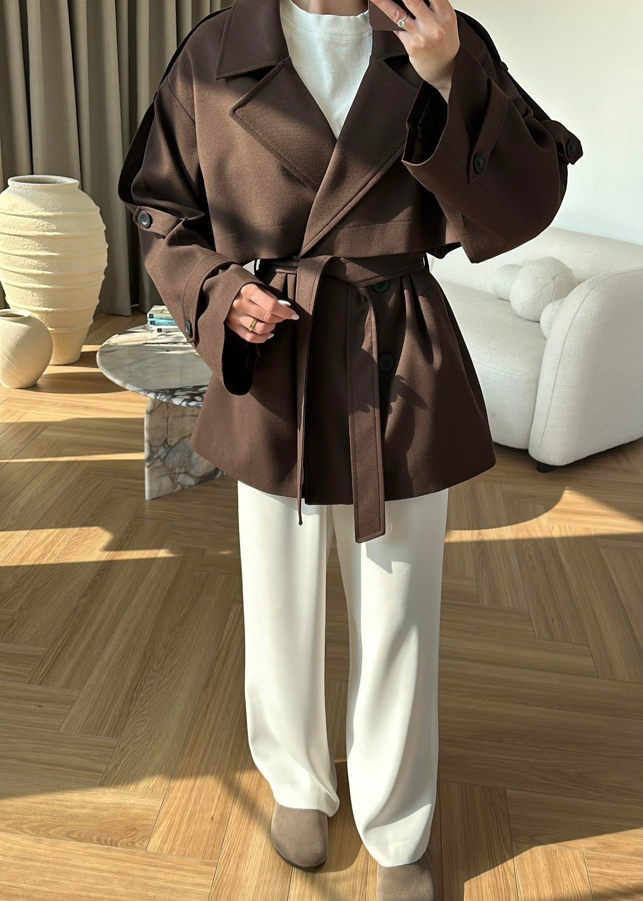 Çekimde S Beden kullanılmıştır,Astarlı kuşaklı ve ceplidir.